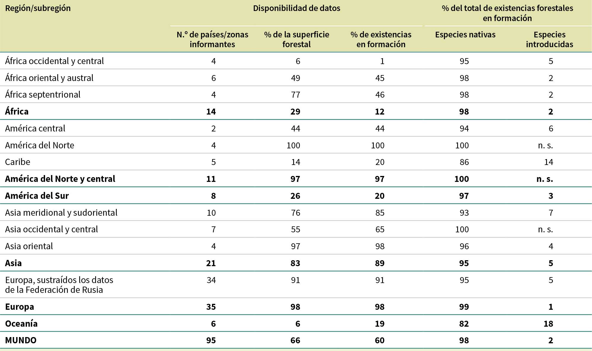 Para la FRA 2025 se recibió información sobre la composición de las existencias forestales en formación de 105 países y zonas, que representaban el 68 % de la superficie forestal mundial y el 63 % de sus existencias en formación. Los países comunicaron información del último año con datos disponibles. Dado que algunos datos recibidos solo eran parciales, el análisis se realizó basándose en 95 países y zonas, que representaban el 66 % de la superficie forestal y el 60 % de las existencias en formación totales. La cobertura de datos fue especialmente baja en África (sobre todo en África occidental y central), Oceanía y América del Sur; por tanto, los resultados aquí presentados relativos a dichas regiones deberían tratarse con cautela.