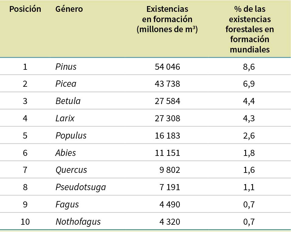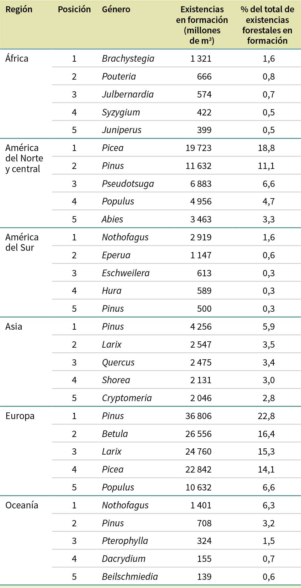 Las especies comunicadas como especies arbóreas nativas e introducidas más comunes en las existencias en formación pertenecen a 385 géneros. El número de géneros comunicados es más elevado en África (158) y Asia (127), seguidas de América del Norte y central (88) y Oceanía (74). Sin embargo, muchos de los informes presentados incluían información incompleta en relación con este atributo y varios países y zonas proporcionaron la composición solo a nivel de género. En el Cuadro 47 se muestran los 10 géneros principales comunicados (por volumen) a escala mundial y en el Cuadro 48 se muestran los cinco géneros principales por región.