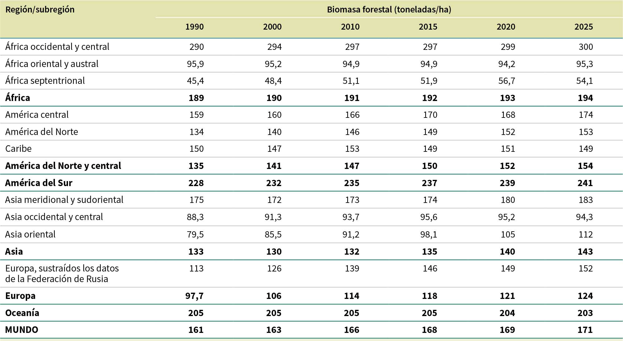 La biomasa forestal por unidad de superficie aumentó 10,5 toneladas por ha a escala mundial entre 1990 y 2025, un incremento del 7 %. Se observaron incrementos en todas las regiones y subregiones excepto en el Caribe, África oriental y austral y Oceanía, donde se mantuvo estable. Asia oriental y Europa (sustraídos los datos de la Federación de Rusia) mostraron los mayores incrementos de biomasa por unidad de superficie entre 1990 y 2025. A escala mundial, la tasa de incremento se aceleró de 0,25 toneladas por ha por año en 1990-2000 a 0,35 toneladas por ha por año en 2015-2025.