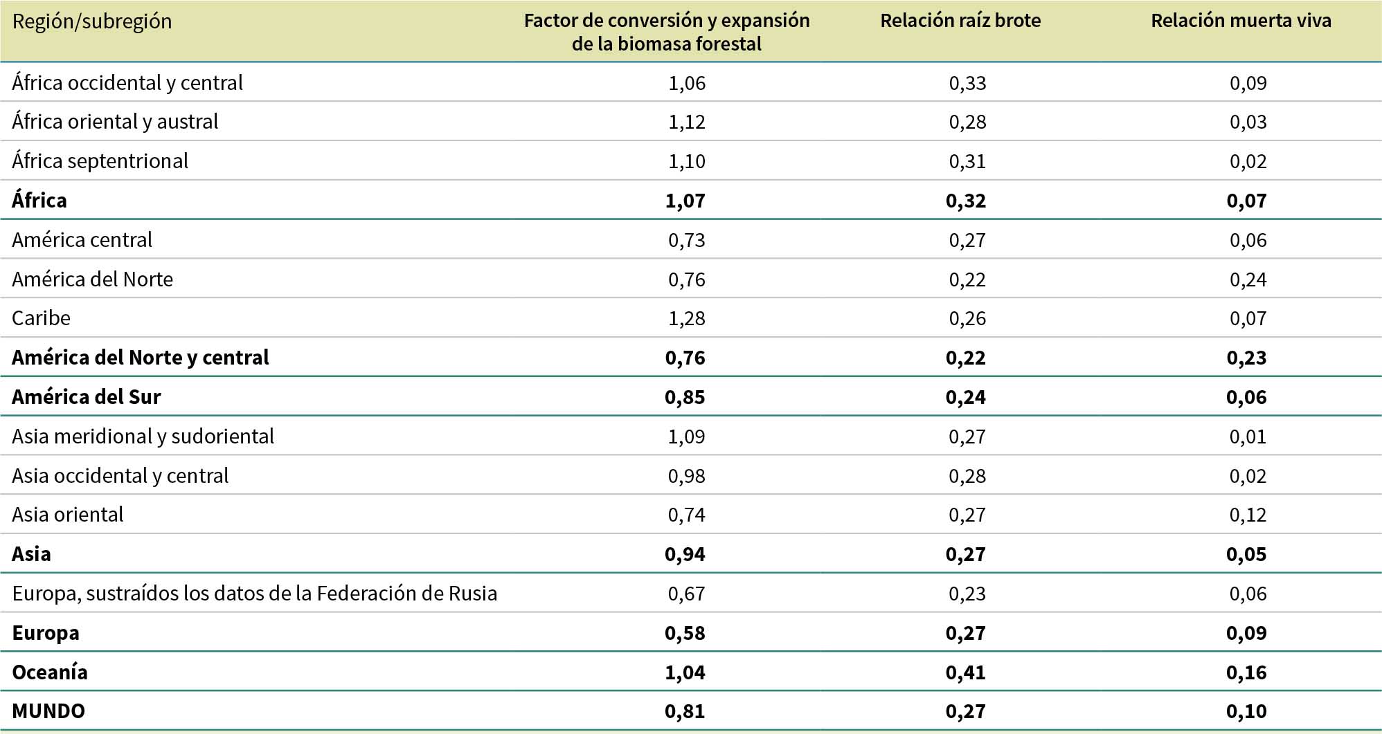 En el Cuadro 53 se muestran los promedios del factor de conversión y expansión de la biomasa11, la relación raíz-brote12 y la relación muerta-viva13 por región y subregión, sobre la base de las estimaciones de las existencias en formación y la biomasa para 2025. Los factores calculados están en consonancia con los intervalos por defecto del IPCC.