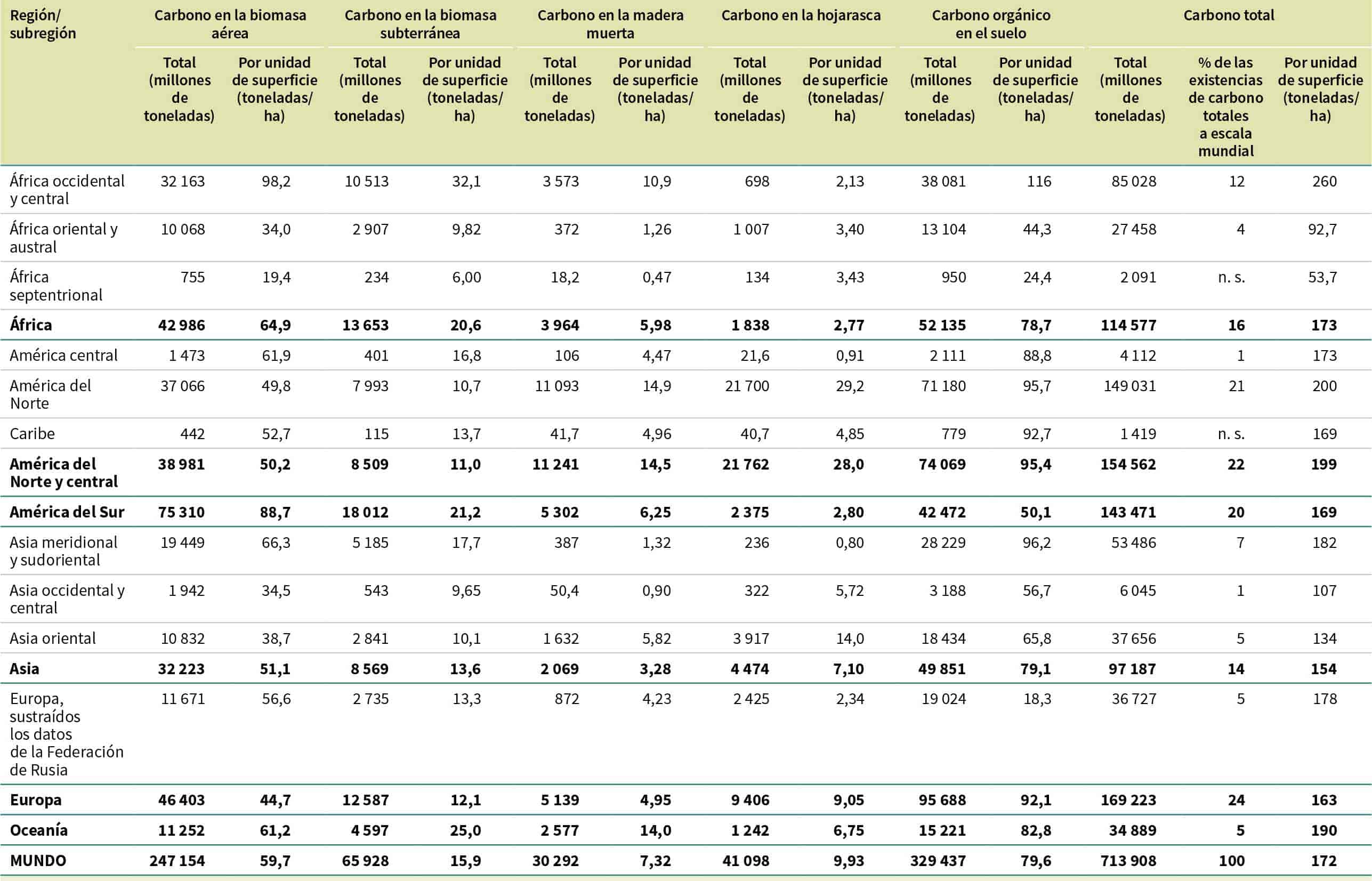 En el caso de los países y zonas que no presentaron informes al respecto, las existencias de carbono se calcularon multiplicando los promedios subregionales de cada uno de los reservorios de carbono por la superficie forestal, a excepción del carbono orgánico en el suelo, cuyas estimaciones se obtuvieron del Mapa mundial sobre el carbono orgánico del suelo. En este mapa, que proporciona una cuadrícula de carbono en el suelo de 1 km para una profundidad de 0 a 30 cm, se aplicaron las capas disponibles de cobertura arbórea y forestal mundial que se correspondían de manera más adecuada con las superficies forestales notificadas a fin de obtener estimaciones específicas de cada país (en lugar de utilizar promedios regionales) (FAO y Grupo técnico intergubernamental sobre los suelos [GTIS], 2020).