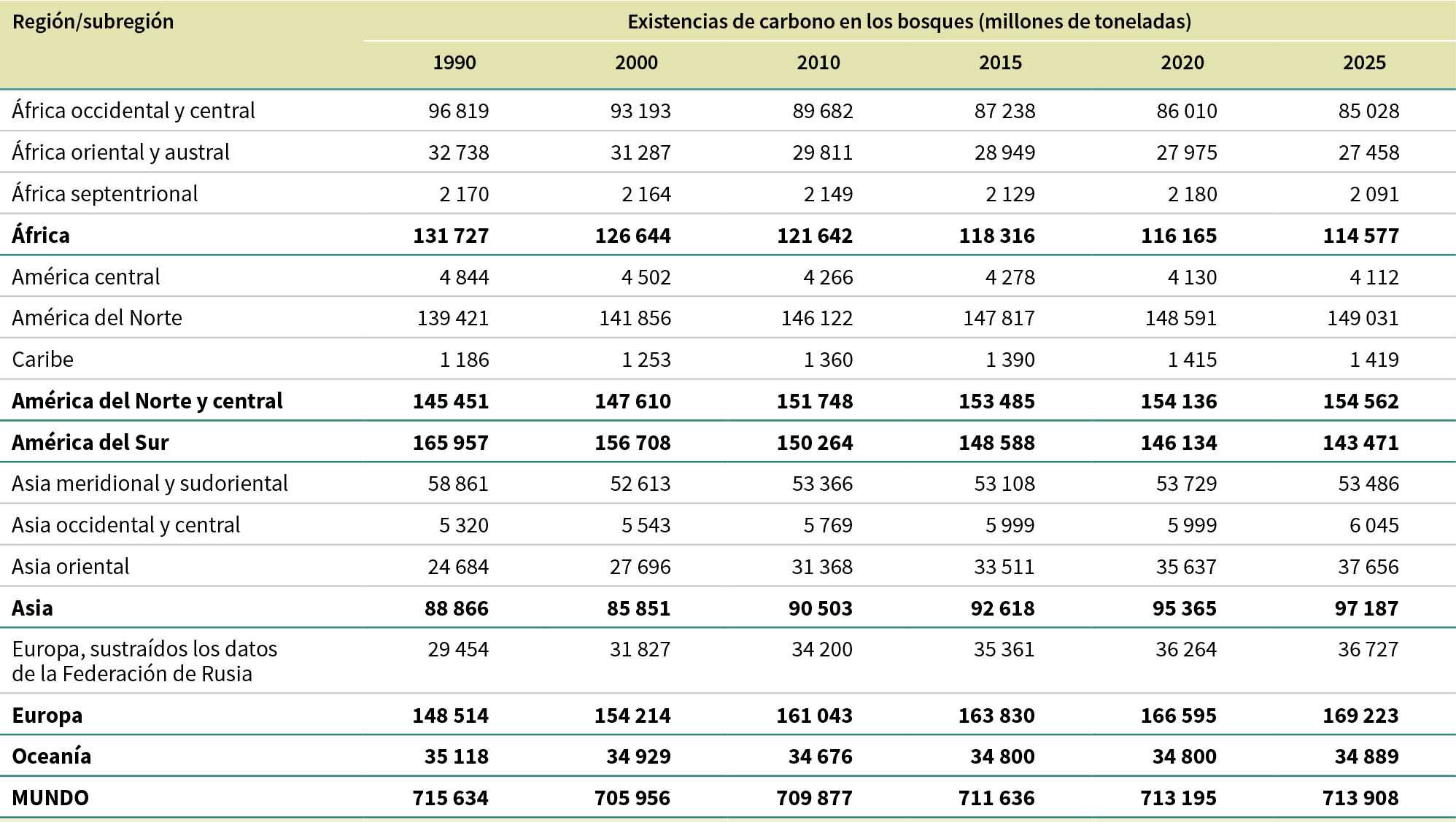 Las existencias de carbono en los bosques a escala mundial disminuyeron entre 1990 y 2000, pasando de 716 Gt a 706 Gt, y aumentaron después a 714 Gt en 2025 (Cuadro 55). El incremento tras el año 2000 puede atribuirse mayormente a un incremento de la superficie forestal en determinadas regiones, especialmente Asia y Europa. Las existencias mundiales de carbono en 2025 son similares a las de 1990, pero se observan diferencias regionales y subregionales. Por ejemplo, las existencias de carbono en los bosques son significativamente más elevadas en 2025 que en 1990 en Asia oriental, Europa y América del Norte, impulsadas por la expansión de la superficie forestal, y considerablemente más bajas en América del Sur, África y América central (en orden descendente por tasa de cambio) (Figura 28).
