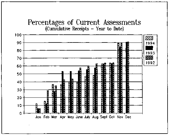 142. The month-end cumulative percentages of 1994 assessments received during the ten-and-a-half months of 1994, as compared to receipts during the preceding four years, was shown in the following statistics.