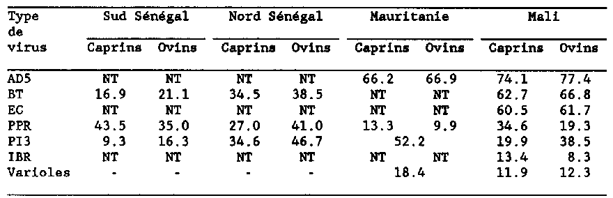 Bien que jusqu'ici aucun foyer clinique n'ait été observé en zone sahélienne, la présence du virus de la bluetongue est très fréquemment signalée (Lefèvre et Taylor, 1983; Sarr et al, 1987a; Maïga et Sarr, 1988). Le rôle de ce virus ainsi que celui des virus para-influenza 3 et rhinotrachéite infectieuse bovine, des virus primitivement rencontrés chez l'espèce bovine sont encore relativement méconnus (le Jan et al, 1987; Sarr et al, 1987a; Maïga et Sarr, 1988).