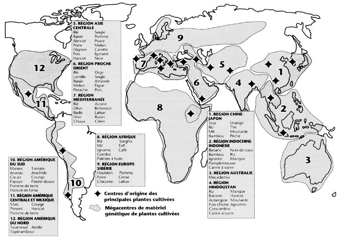 Toutes les principales cultures vivrières de base pratiquées et consommées par l'immense majorité de la population mondiale sont originaires des zones tropicales et subtropicales d'Asie, d'Afrique et d'Amérique latine. Au fil des ans, les agriculteurs ont sélectionné et acclimaté toutes les grandes cultures vivrières dont dépend aujourd'hui l'humanité. Ainsi, le blé et l'orge sont venus du Proche-Orient, le soja et le riz de Chine, le sorgho, les ignames et le café d'Afrique. Les pommes de terre et les tomates proviennent des Andes-en Amérique du Sud, et le maïs d'Amérique du Sud et d'Amérique centrale.