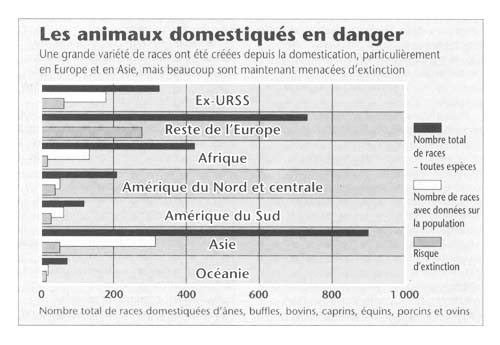 En Europe, la moitié des races qui existaient à la fin du siècle se sont éteintes; un tiers des 770 races restantes sont en danger de disparaître au cours des 20 prochaines années. En Allemagne, par exemple, il ne reste plus que cinq races indigènes de bétail alors que l'on en comptait au moins 35. En Amérique du Nord, plus du tiers des races de bétail et de volaille sont considérées comme rares ou en voie de disparition.