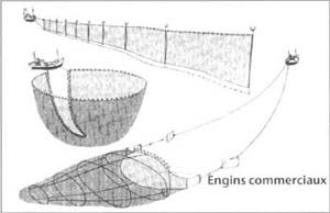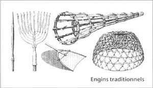 | Les engins de pêche traditionnels, qui vont du simple harpon à un piège à poisson en forme de panier, sont typiquement sélectifs aussi bien pour ce qui est des tailles que des espèces capturées, et ils sont adaptés à la diversité des poissons capturés; par contre, les engins commerciaux tels que les sennes coulissantes, les grands filets dérivants et les chaluts ramènent souvent des captures accessoires d'espèces indésirées. La renonciation aux méthodes de pêche traditionnelles, associée à l'introduction de nouveaux matériels et à une forte mécanisation des opérations ont contribué à la surexploitation des ressources en milieu marin comme en eau douce. |