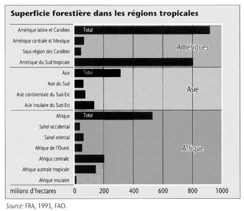 Alors que dans les zones tempérées la superficie reboisée dépasse maintenant celle qui a été déboisée, la disparition des forêts tropicales est quant à elle préoccupante. Une enquête récente de la FAO indique que ces forêts ont été détruites à raison de 15,4 millions d'hectares par an entre 1980 et 1990. Pour ce qui est de la superficie boisée, les pertes les plus considérables ont été observées en Amérique latine et aux Caraïbes (en moyenne 7,4 millions d'hectares par an), suivies de l'Afrique (4,1 millions d'hectares par an) et de l'Asie-Pacifique (3,9 millions d'hectares par an).
