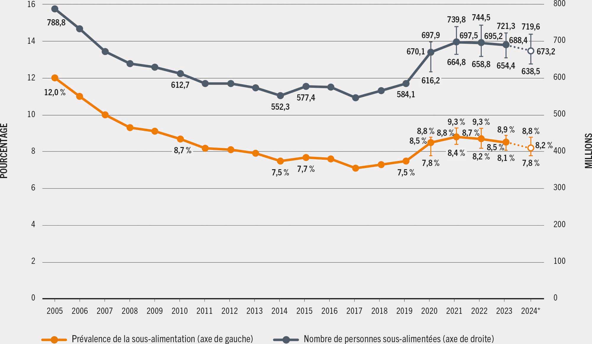 - ➔ On estime qu’entre 638 millions et 720 millions de personnes, soit respectivement 7,8 pour cent et 8,8 pour cent de la population mondiale, ont souffert de la faim en 2024. L’estimation ponctuelle (673 millions de personnes en 2024) représente une diminution de 15 millions par rapport à 2023 et de 22 millions par rapport à 2022.