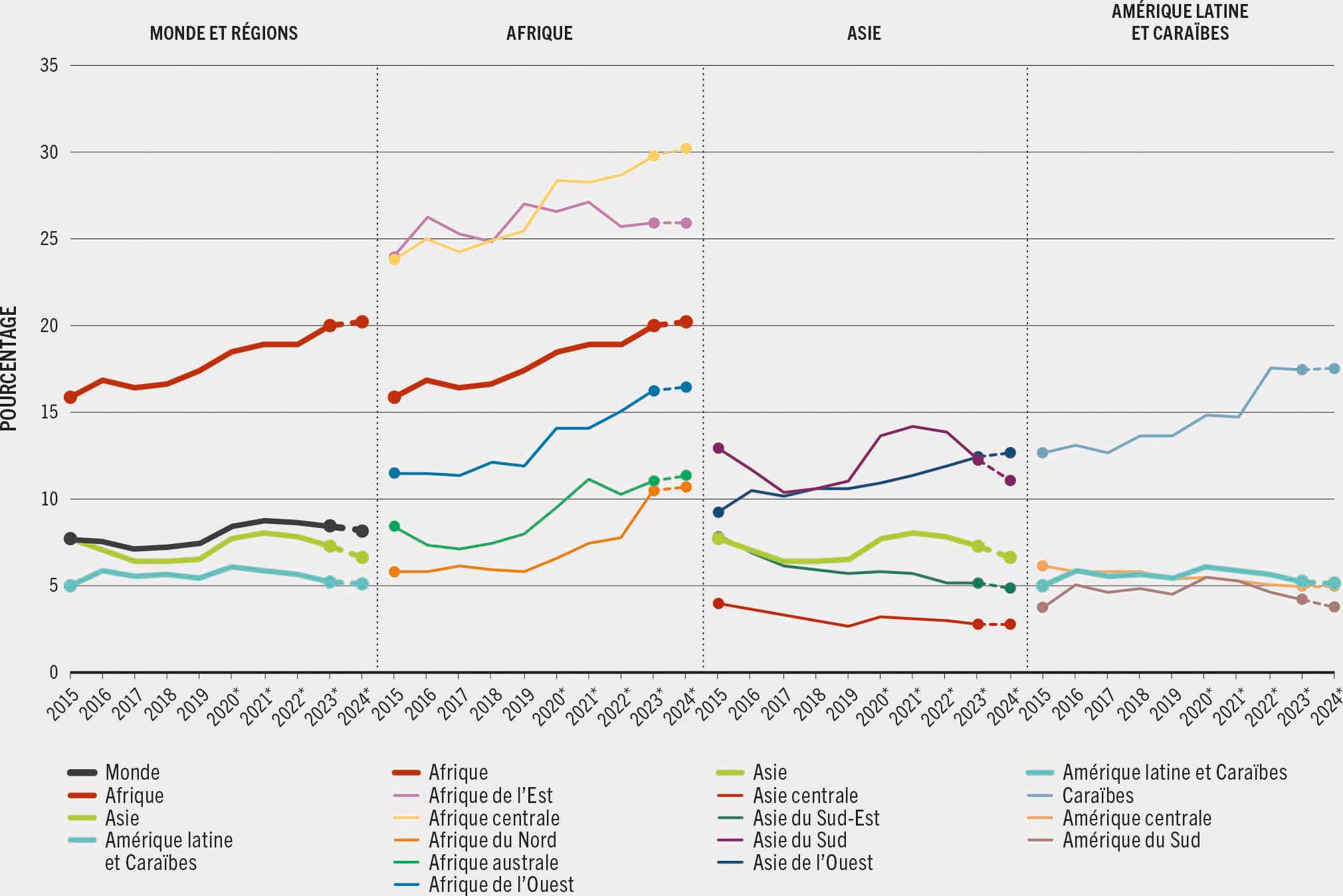 Malgré les progrès accomplis ces dernières années, les estimations mondiales pour 2024 restent bien supérieures aux niveaux observés avant la pandémie, et même à ceux enregistrés en 2015, au moment où le Programme 2030 a démarré (figure 2.1). On estime qu’environ 96 millions de personnes supplémentaires dans le monde ont souffert de la faim chronique en 2024 par rapport à 2015.