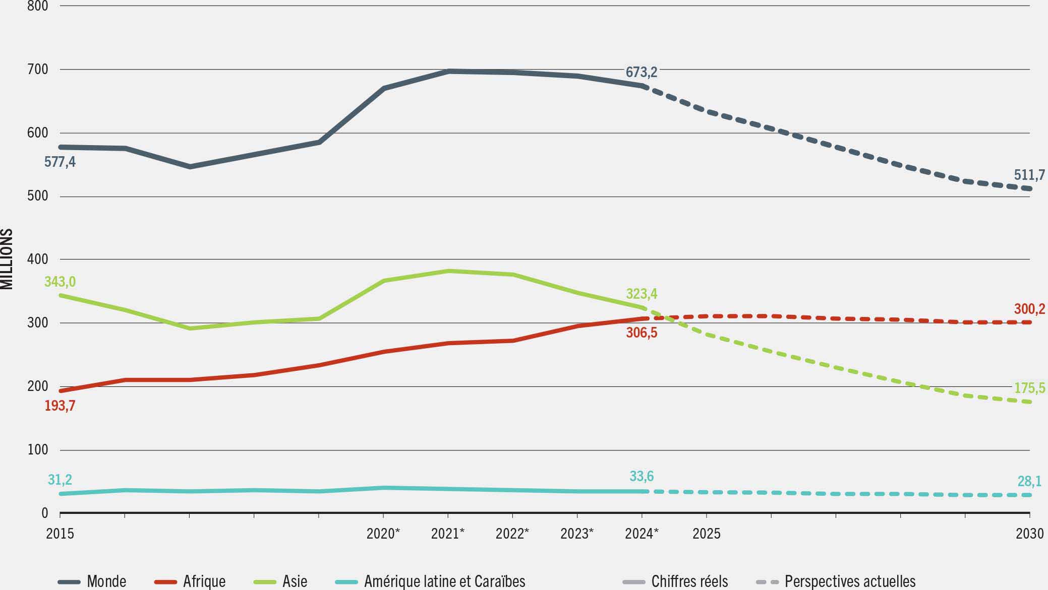 - ➔ Le nombre de personnes sous-alimentées dans le monde devrait diminuer entre 2025 et 2030, mais les projections indiquent que 512 millions de personnes souffriront encore de la faim en 2030, et qu’elles seront concentrées pour près de 60 pour cent en Afrique.
