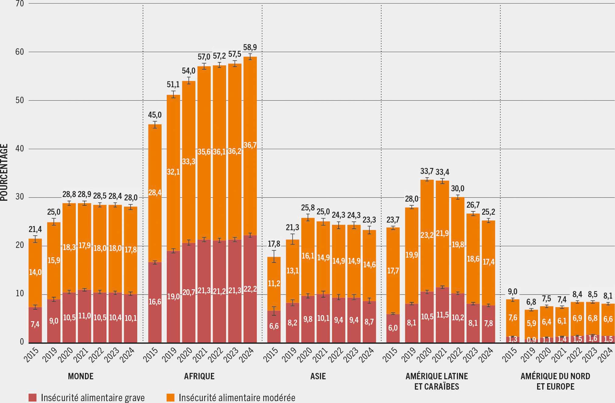 Au niveau mondial, la prévalence de l’insécurité alimentaire (insécurité alimentaire modérée et insécurité alimentaire grave associées ou insécurité alimentaire grave uniquement) recule très progressivement depuis 2021, après une forte augmentation à la suite de la pandémie de covid-19 en 2020. De 2023 à 2024, la prévalence de l’insécurité alimentaire modérée ou grave à l’échelle mondiale a légèrement diminué, passant de 28,4 pour cent à 28,0 pour cent (figure 2.4 et tableau 2.3). On estime actuellement que l’insécurité alimentaire modérée ou grave a touché 2,3 milliards de personnes environ dans le monde en 2024, soit 335 millions de plus qu’en 2019, avant la pandémie, et 683 millions de plus qu’en 2015, lorsque le Programme 2030 a démarré (tableau 2.4).
