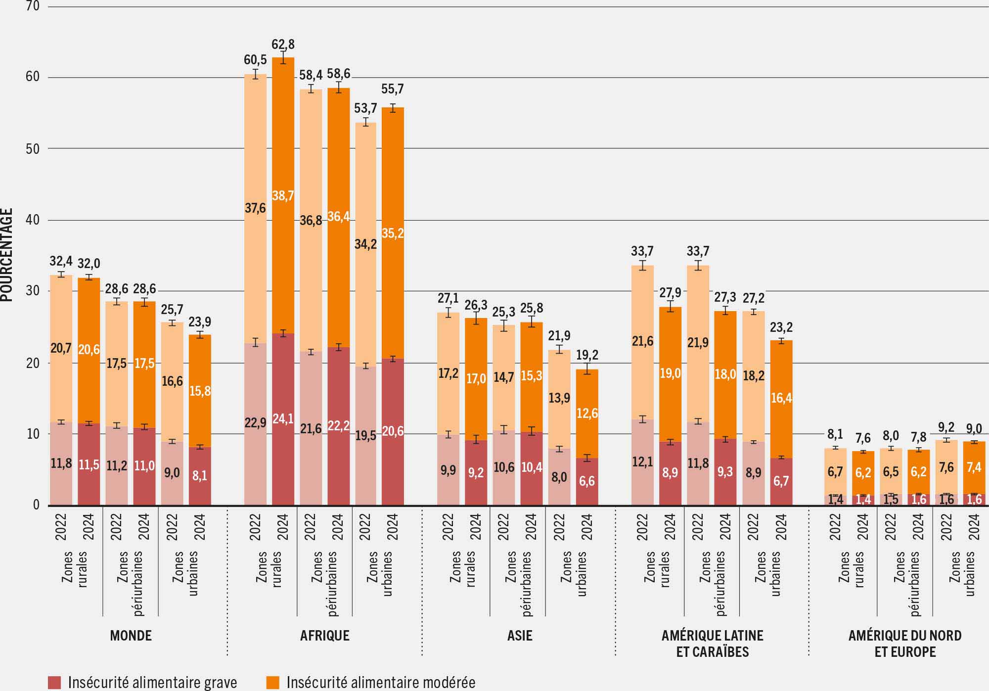 - ➔ À l’échelle mondiale et dans toutes les régions du monde, à l’exception de l’Amérique du Nord et de l’Europe, la prévalence de l’insécurité alimentaire modérée ou grave est plus élevée dans les zones rurales que dans les zones urbaines, tandis que la situation relative dans les zones périurbaines diffère selon les régions. De 2022 à 2024, l’insécurité alimentaire a reculé uniquement dans les zones urbaines au niveau mondial et en Asie. Les améliorations se répartissaient plus équitablement entre les zones rurales, les zones périurbaines et les zones urbaines en Amérique latine et dans les Caraïbes, tandis qu’en Afrique, l’insécurité alimentaire s’est aggravée à la fois dans les zones rurales et dans les zones urbaines, et n’a pratiquement pas évolué dans les zones périurbaines.