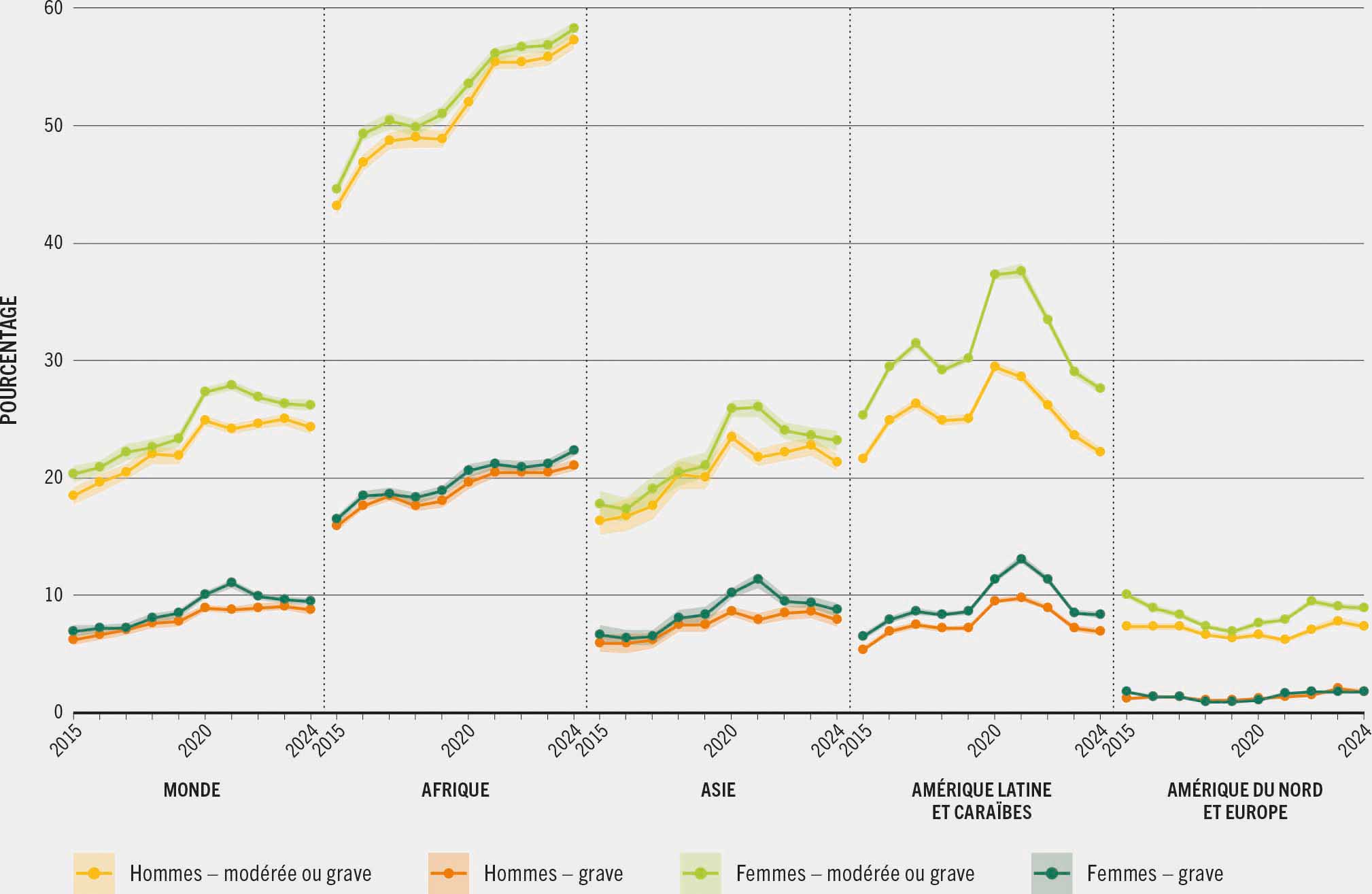 Pour l’insécurité alimentaire modérée ou grave, le creusement de l’écart entre les femmes et les hommes de 2023 à 2024 est principalement le fait de l’Asie, où il est passé de 1,0 point de pourcentage à 1,9 point de pourcentage, et de l’Amérique du Nord et de l’Europe, où il est passé de 1,2 point de pourcentage à 1,6 point de pourcentage.