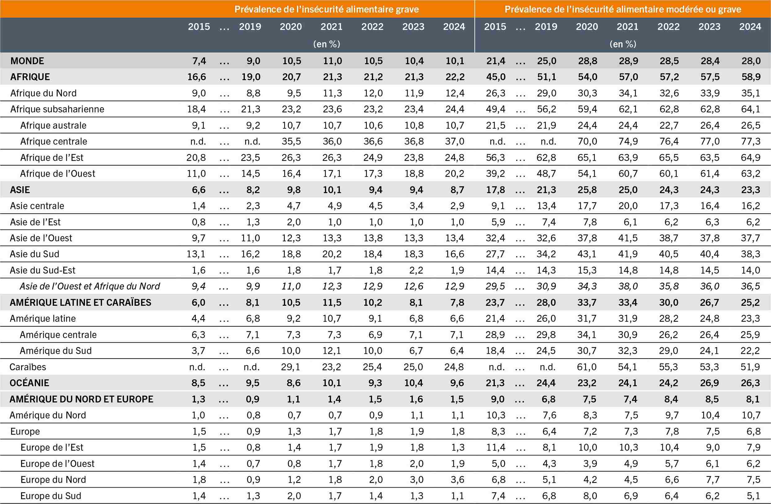 TABLEAU 2.3PRÉVALENCE DE L’INSÉCURITÉ ALIMENTAIRE GRAVE UNIQUEMENT ET DE L’INSÉCURITÉ ALIMENTAIRE MODÉRÉE OU GRAVE, ÉVALUÉE SELON L’ÉCHELLE DE MESURE DE L’INSÉCURITÉ ALIMENTAIRE VÉCUE (2015-2024)
