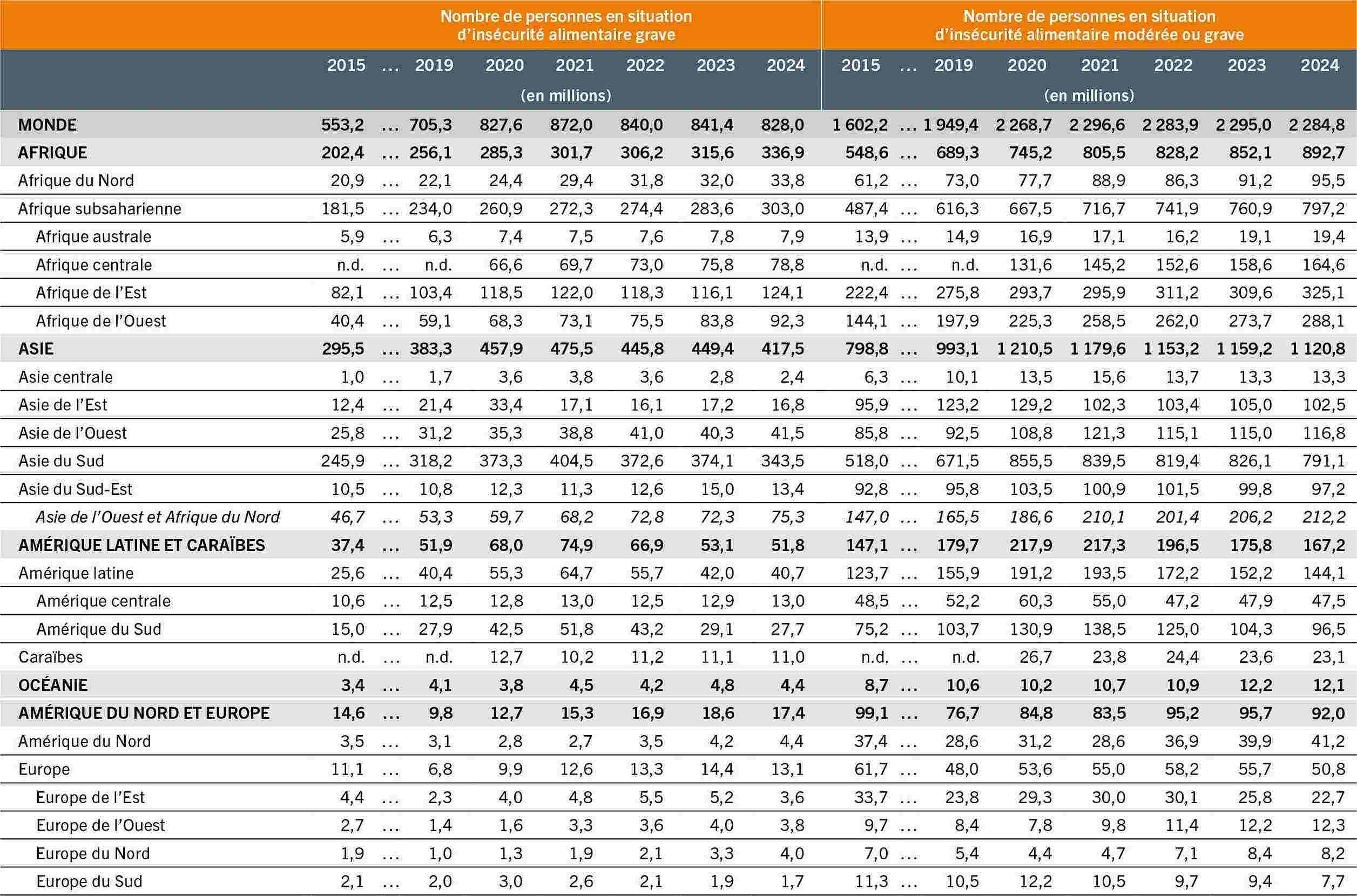 TABLEAU 2.4NOMBRE DE PERSONNES EN SITUATION D’INSÉCURITÉ ALIMENTAIRE GRAVE UNIQUEMENT ET EN SITUATION D’INSÉCURITÉ ALIMENTAIRE MODÉRÉE OU GRAVE, ÉVALUÉ SELON L’ÉCHELLE DE MESURE DE L’INSÉCURITÉ ALIMENTAIRE VÉCUE (2015-2024)