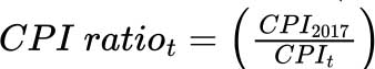 Le coût des biens et services de base non alimentaires (nj) est déjà exprimé en PPA de 2017, et le coût d’une alimentation saine est converti de ses valeurs actuelles (ct) en valeurs en PPA de 2017 (ct2017 PPP) à l’aide de la formule suivante: