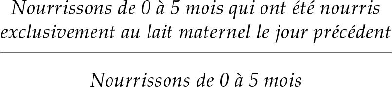 L’indicateur est le pourcentage de nourrissons de 0 à 5 mois alimentés exclusivement par du lait maternel, sans aliment ni boisson supplémentaire, pas même de l’eau, au cours des 24 heures précédant l’enquête.