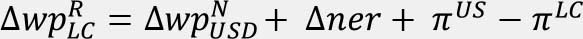 où WP (pour «world price») désigne le prix mondial du produit sélectionné et LC (pour «local currency») la monnaie locale, R (pour «real») le prix réel (corrigé de l’inflation), N (pour «nominal») le prix nominal, NER (pour «nominal exchange rate») le taux de change nominal bilatéral d’un pays par rapport au dollar, tandis que CPIUS/CPILC (pour «consumer price index») représente le ratio entre l’IPC aux États-Unis d’Amérique et l’IPC dans le pays considéré. Ensuite, la formule est exprimée en termes relatifs, comme indiqué ci-dessous: