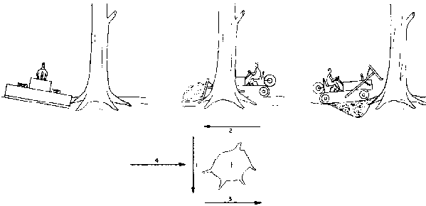 FIGURA 26. - Modo de seccionar las raíces de árboles gruesos. A la izquierda: seccionar las raíces en el lado 1; en el centro: seccionar las raíces en los lados 2 y 3; a la derecha: construir una rampa en el lado 1 y empujar en el lado 4.