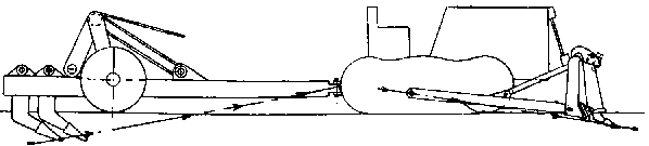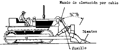 Por el contrario, el esfuerzo de presión ejercido por el tractor sobre los dientes fijos montados en el bulldozer se dirige hacia abajo y tiende a mantener los dientes clavados, sea cualquiera la resistencia del suelo, retenidos por el cable o los husillos. El tractor no puede así saltar, su adherencia es mayor y su potencia se utiliza al máximo (Figura 30).