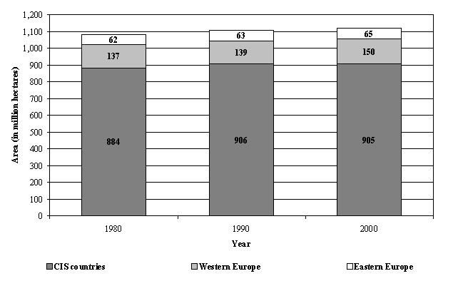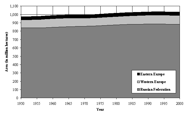 Source: derived from Gold (2003), Annex 5.1. Note: the Eastern Europe region excludes the Baltic States and four of the five countries of the former Yugoslavia. The forest area shown here is FAWS, except for a few countries where statistics were provided for other definitions of forest area. See Section 1.4.1 for further details and explanation.