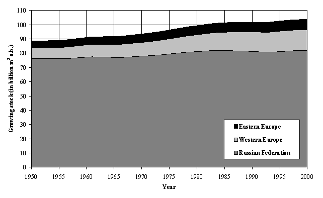The highest rate of growth has occurred in Western Europe, where growing stock has increased by 91 percent (or 7 billion m3 o.b.) since 1950. In the selected countries of Eastern Europe, growing stock has increased by 51 percent (or 2 billion m3 o.b.) and growing stock in the Russian Federation has increased by eight percent (or 6 billion m3 o.b.). These changes in growing stock volume have mostly occurred due to changes in forest management (supported by changes in forestry policy) and, to a lesser extent, natural causes.