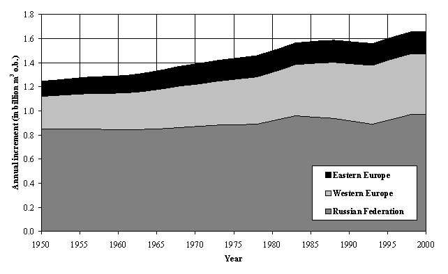 Figure 7 shows that annual increment in Europe has increased since 1950 by 33 percent or 411 million m3 o.b., from 1,246 million m3 o.b. in 1950 to 1,657 million m3 o.b. in 2000. Western Europe accounts for the majority of this increase, where annual increment has risen by 87 percent or 234 million m3 o.b. over the period. Annual increment has increased over the last 50 years by 45 percent (57 million m3 o.b.) in Eastern Europe and 14 percent (120 million m3 o.b.) in the Russian Federation.