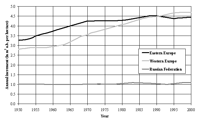 In terms of annual increment per hectare, the increase in forest growth in Western Europe is also remarkable, having risen from 2.8 m3 o.b. to 4.7 m3 o.b. over the same period. Annual increment per hectare in Eastern Europe increased in the earlier part of the period to 4.3 m3 o.b. in 1970, but has increased very little since then. In the Russian Federation, forest growth has remained at around 1 m3 o.b. per hectare per year over the whole period.