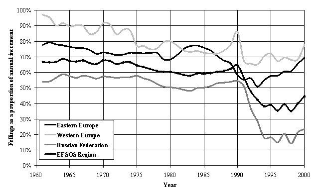 Source: increment is derived from Gold (2003), Annex 5.3 and the statistics for fellings come from FAOSTAT roundwood production statistics (http://faostat.external.fao.org) adjusted to fellings using conversion factors from the FRA (UN, 2003). Note: the Eastern Europe region excludes the Baltic States and four of the five countries of the former Yugoslavia. In addition, Turkey is excluded from the analysis due to the quality of woodfuel production statistics for that country. Fellings in the Russian Federation before 1992 have been estimated from statistics for the USSR (see Section 1.4.2).