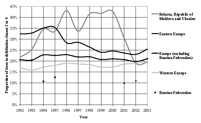 These trends show no increase or decrease in defoliation at the European level over the last decade, although a slight upward trend can be observed for Western Europe and a much larger trend downwards appears for Eastern Europe , attributable to the end of the massive emissions of pollutants from industry and energy plants in the former centrally planed economies. The few available observations for the Russian Federation also suggest that defoliation there has not changed much over the last decade, although the number of observations is very small.