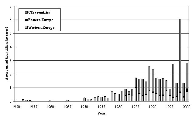 Forest fires. Statistics on the number of forest fires and area burned have been collected by UNECE and FAO since the early 1950s. However, the collection of these statistics on an annual basis did not start until 1970 and a reasonably complete set of data for the countries outside Western Europe is only available from 1982 onwards. Based on these statistics, the trends in the area of forest fires since 1950 have been produced and are shown in Figure 11.