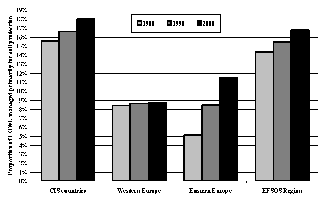 Figure 12 Trends in the proportion of FOWL managed primarily for soil protection in selected European countries from 1980 to 2000