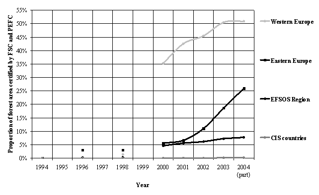 These trends can not be used to suggest that the quality of forest management in Europe has increased over the last decade. However, these trends do suggest that it has been relatively easy for forest owners and managers to obtain certification over a significant part of the European forest estate. This, in turn, implies that the quality of forest management in Europe is generally quite high.