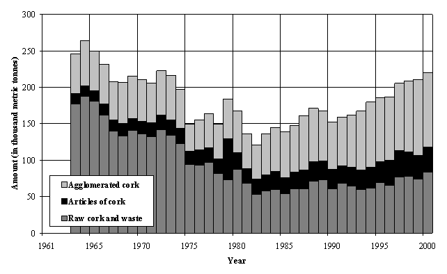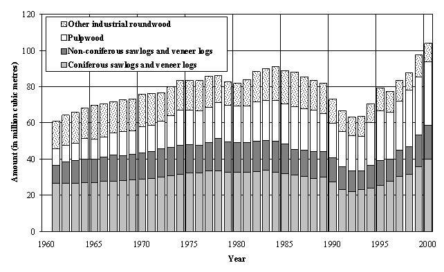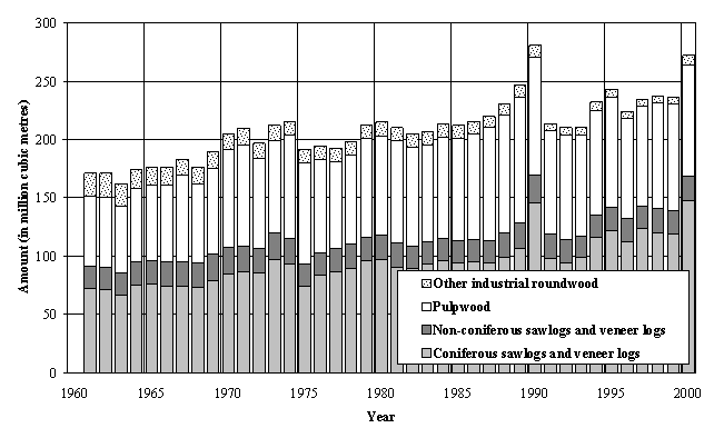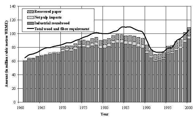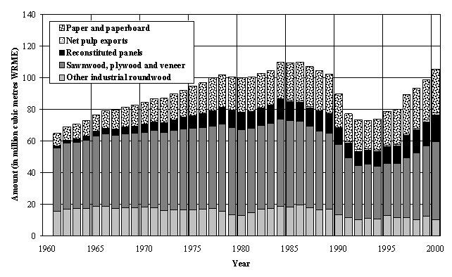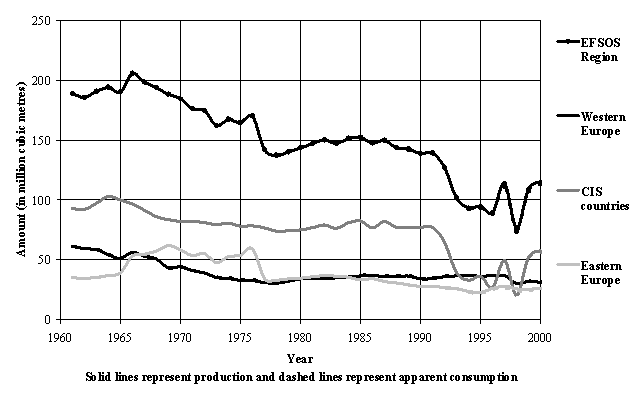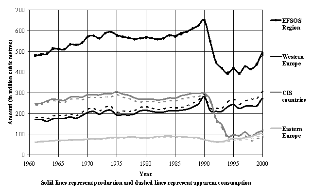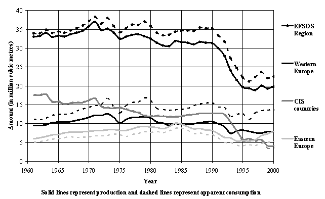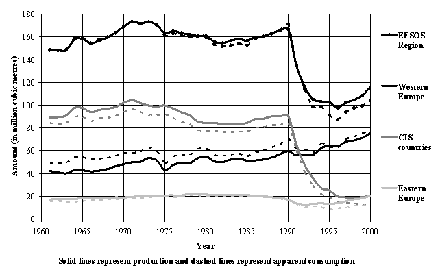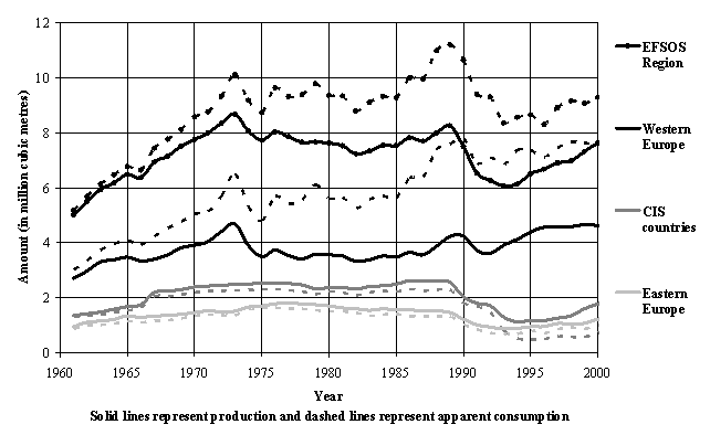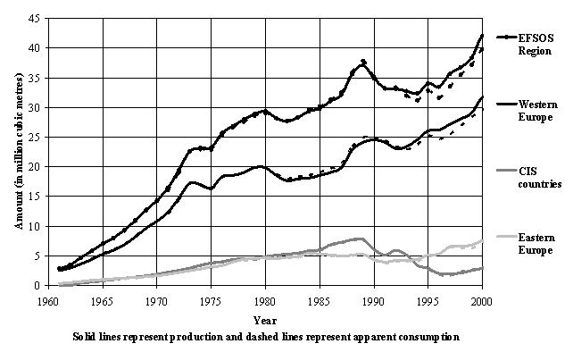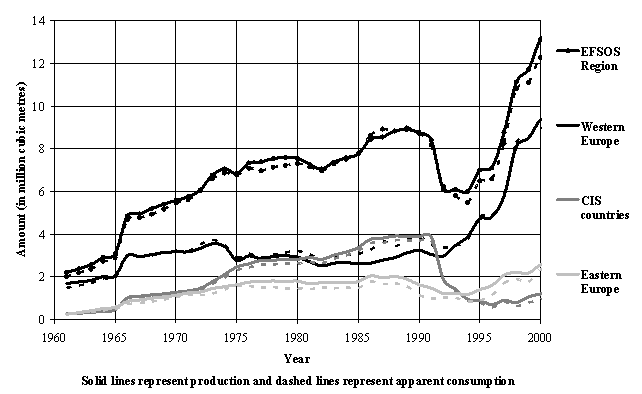 The first and probably most important feature of these trends is that Europe has changed from a situation of approximate balance in production and consumption over the period 1960 to 1990 to a situation of net exports from the region (to the rest of the World) over the last ten years. In 1990, European consumption exceeded production slightly and Europe was a net importing region. By 2000, the situation had changed to one where European production exceeded consumption by just over 10 million m3 (or around 10 percent of production). Furthermore, the level of net exports from Europe has continued to increase to around 15 million m3 in 2002.