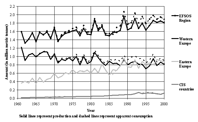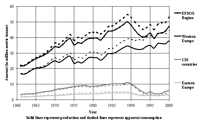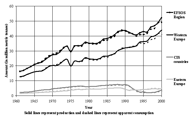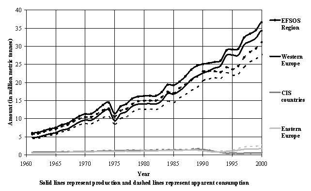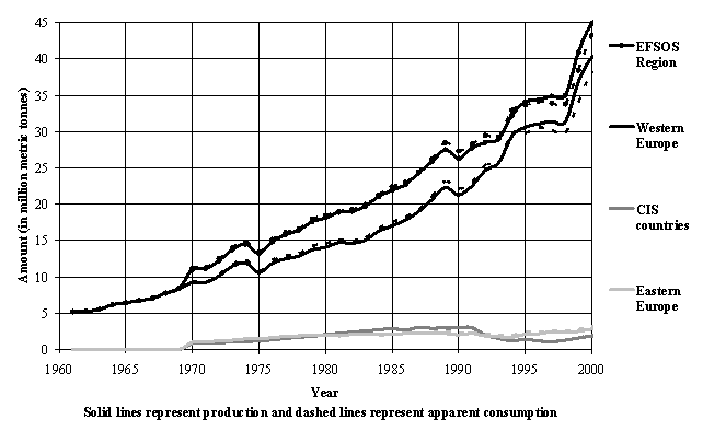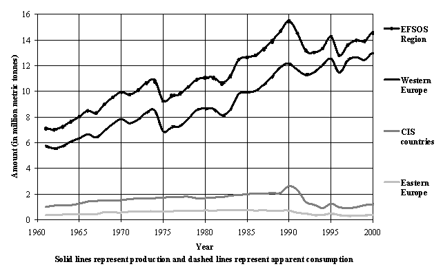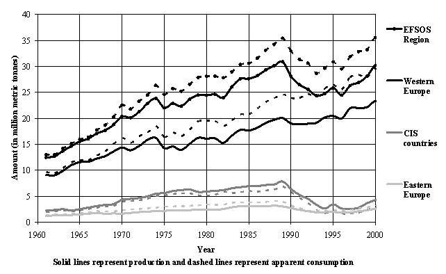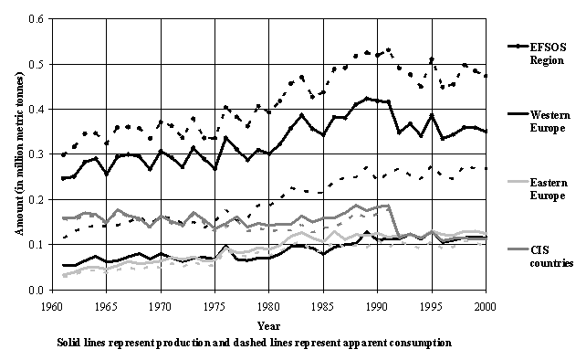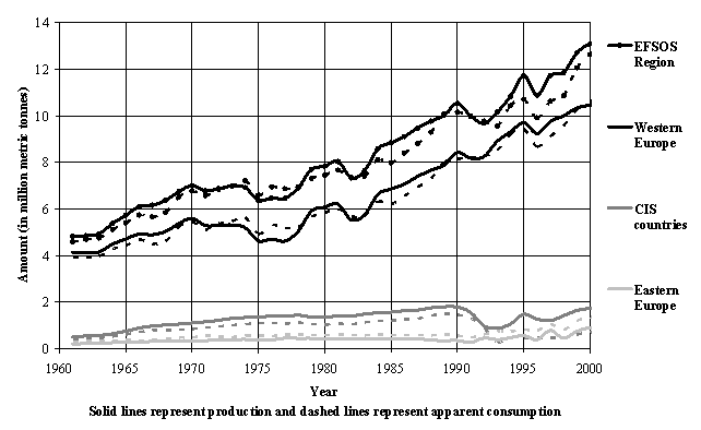 A second notable feature of Figure 16 is that the distribution of production and consumption across all three sub-regions is more even. Production in the CIS sub-region has declined from about half of the total in 1961 to one-quarter in 2000. Production in the rest of Europe in 2000 was divided equally between Western and Eastern Europe. Western Europe accounted for about half of all consumption in 2000, with the remainder shared equally between the Eastern Europe and CIS sub-regions.