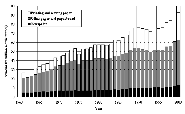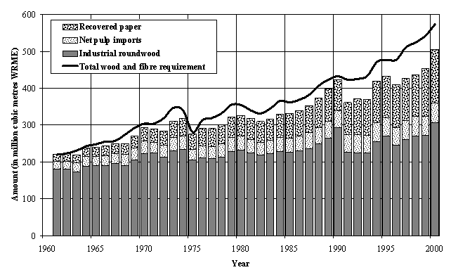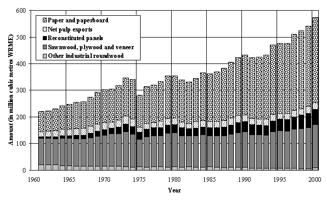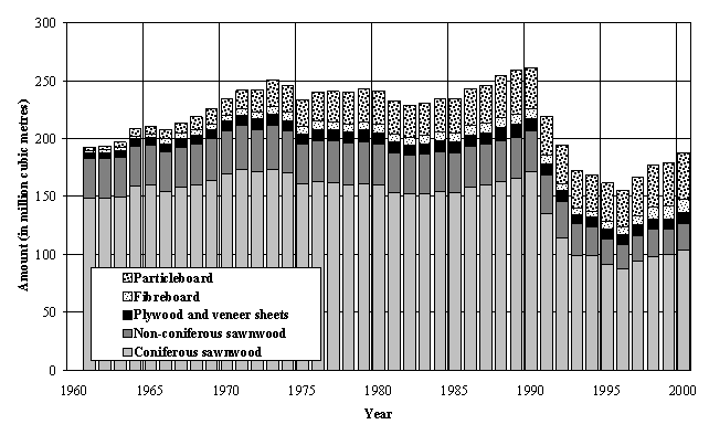 Processed wood products are those products that are produced by the forest processing industry and are consumed by other industries outside the sector or consumers. At the broad level, these include: sawnwood; wood based panels; and paper and paperboard.3 Trends in the production and consumption of each of these products are described below and this section finishes with a description of some of the changes in the relative importance of these products over the last 40 years.