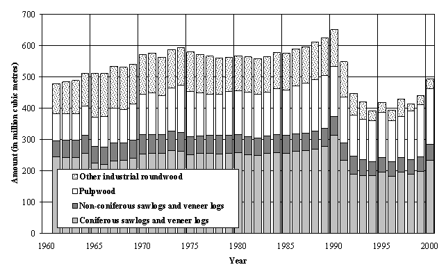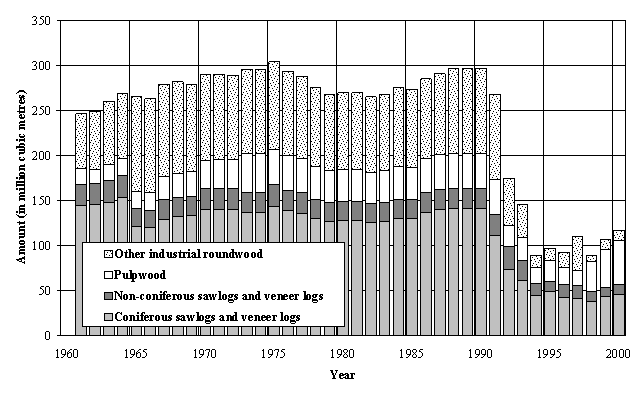 In general, the main reason for the increase in growing stock in the Russian Federation is that fellings have always been far below increment. For example, since 1950, annual increment has varied from 850 million m3 o.b. to 970 million m3 o.b., while the volume of fellings has varied from 500 million m3 o.b. to 250 million m3 o.b. (in more recent years). As in Eastern Europe, this shortfall combined with the gradual maturation of many stands has led to the trend displayed in Figure 5.