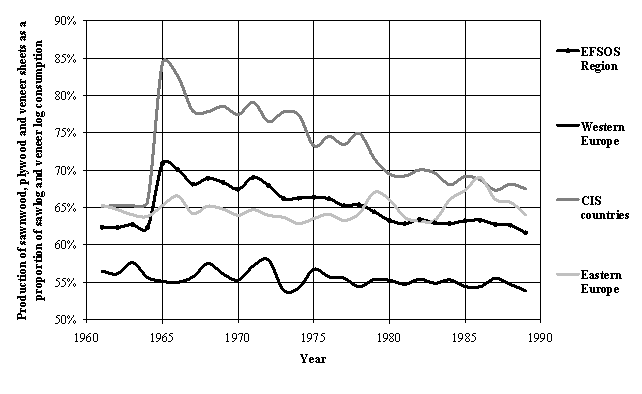 This decline has occurred for two reasons. Firstly, improvements in labour productivity have resulted in a reduction in the demand for labour, particularly in the two forest processing sectors. The second reason for this decline has been the reduction in production over the last decade in Eastern Europe and the CIS sub-region.