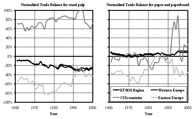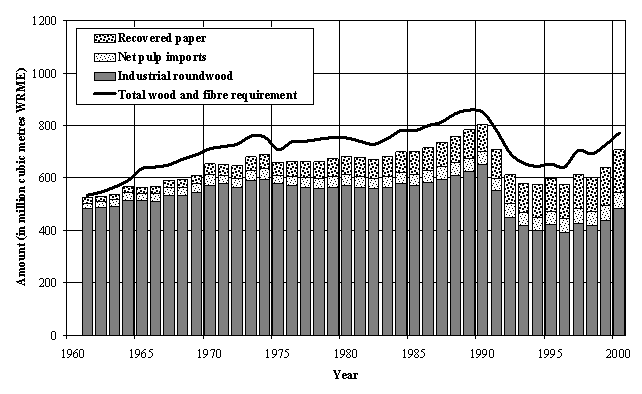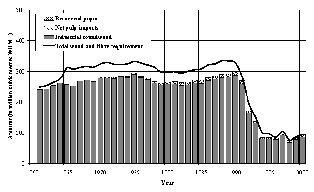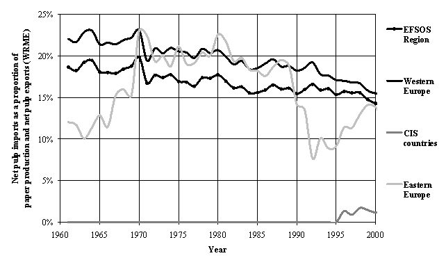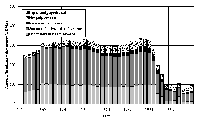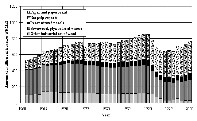 6 Note that, for pulp trade, countries have been divided into two groups for each year: net exporters and net importers. The wood required to produce net pulp exports is shown here only for those countries that are net pulp exporters. For the countries that are net importers of pulp, the wood raw material equivalents of these imports are shown in the later figures (i.e. as a source of fibre rather than a demand for fibre).