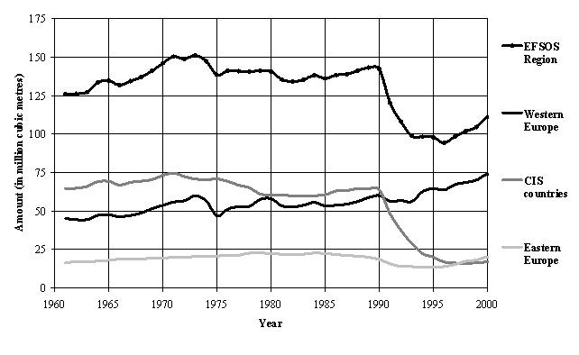 The second interesting feature of this figure is that it shows the dramatic fall in production and consumption in the Eastern Europe and CIS sub-regions in the early-1990s and the degree to which they have recovered since then. In the case of Eastern Europe, production and consumption fell by about one-third in the early-1990s. Since then, production has recovered to a level of 20 million m3 in 2000 (around the same level as in 1990), but consumption in 2000 was only 13 million m3. In the CIS sub-region, the fall in production and consumption was even more dramatic (a fall of around three-quarters). However, production and consumption in both Eastern Europe and the CIS have been growing strongly in the first years of the twenty-first century.