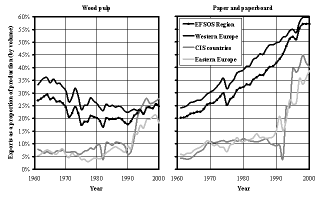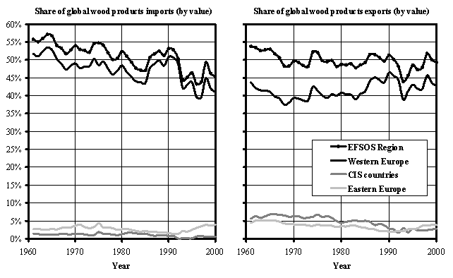8 The value of forest products exports from Western Europe was slightly less than the value of imports in 2000, but the Western European share of global exports exceeded the Western European share of global imports. This is due to the different measurement conventions used for export and import values (i.e. FOB versus CIF).