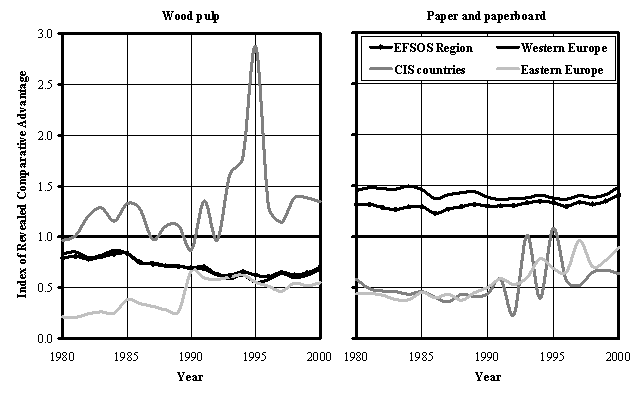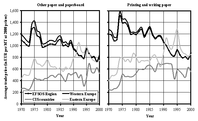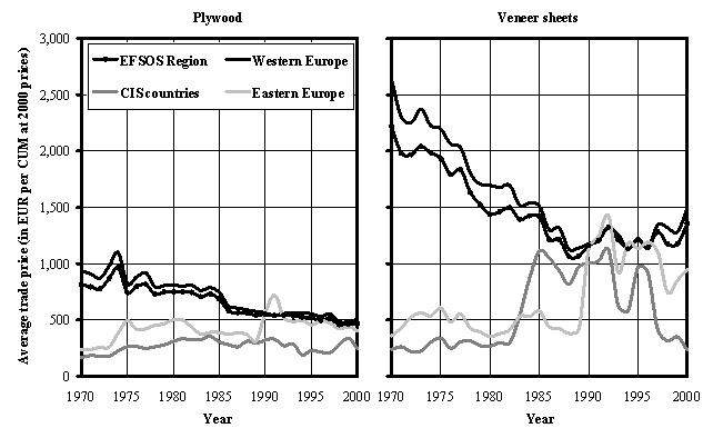 Comparing the trends between the three sub-regions, these figures show an even more startling difference in the levels of productivity. Value-added per employee and value-added per unit of output are an order of magnitude lower in Eastern Europe and the CIS sub-region compared with Western Europe. At the moment, this makes these countries very cost competitive in the production of basic forestry products. The challenge for these countries will be to develop the skills and attract the investment necessary to increase value-added in the forest sector in the future.