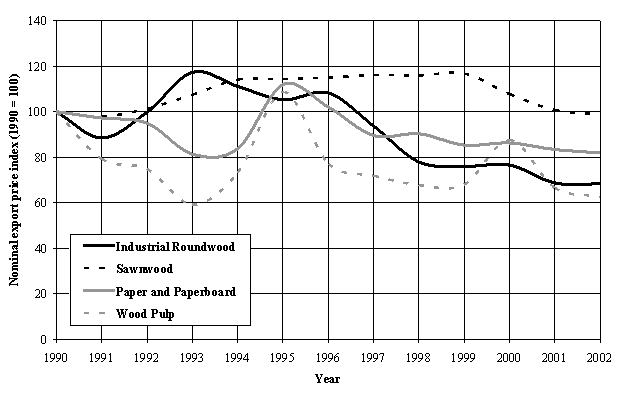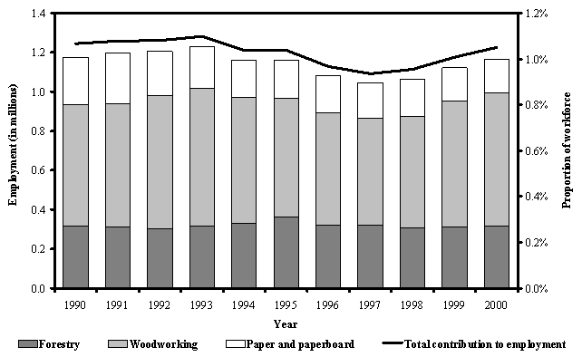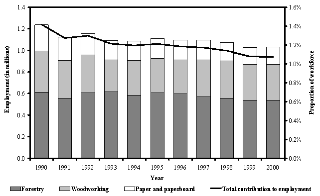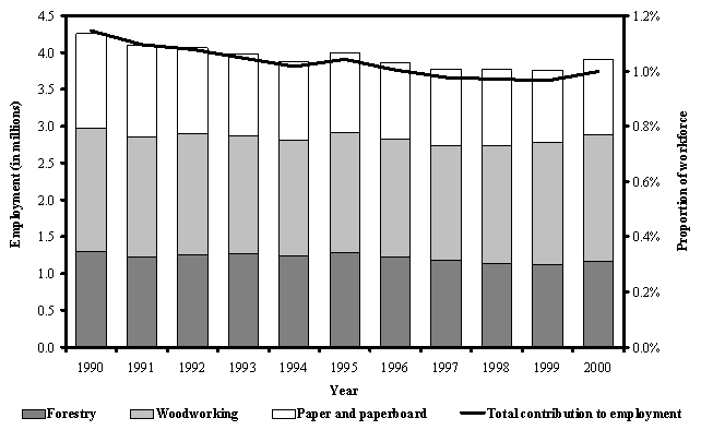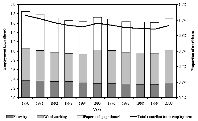 Another interesting feature of this figure is the distribution of employment between the different components of the sector. Broadly speaking, employment was divided almost equally between the three components of the sector in 1990, with a slightly higher proportion of people employed in the woodworking industries. By 2000, employment in forestry and manufacturing of paper and paperboard had both shrunk, while employment in the woodworking industries had remained about the same. Thus, the woodworking industry now accounts for a much greater share of total employment in the forest sector.