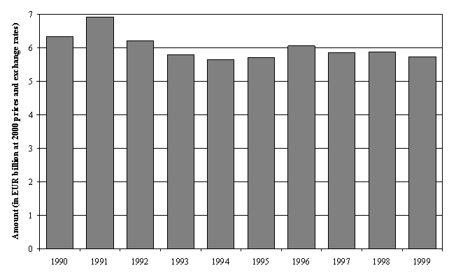 The level of incentives for forestry in Europe is quite high, as is shown in Figure 75. This shows the total level of forestry incentives paid from 1990 to 1999 to eleven European countries (Belgium; Finland; France; Germany; Netherlands; Portugal; Switzerland; Czech Republic; Estonia; Poland; and Slovenia). It includes national grant schemes, the costs of favourable tax treatment, other national subsidies and some, but not all, EC support to the sector. The average annual total level of incentives for the sector is about EUR 6 billion (at 2000 prices and exchange rates). For comparison, the total value of wood production in these eleven countries in the mid-1990s was about EUR 7 billion (at 2000 prices and exchange rates).