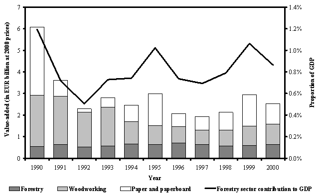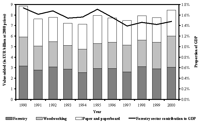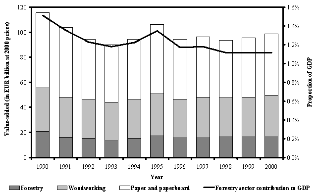 Figure 80 shows the real (i.e. inflation adjusted) trends in value-added in the European forest sector over the last decade. This shows that total value-added has declined in real terms from around EUR 115 billion in 1990 to EUR 100 billion in 2000. Furthermore, the contribution of the sector to GDP has declined from 1.5 percent to 1.1 percent over the same period.