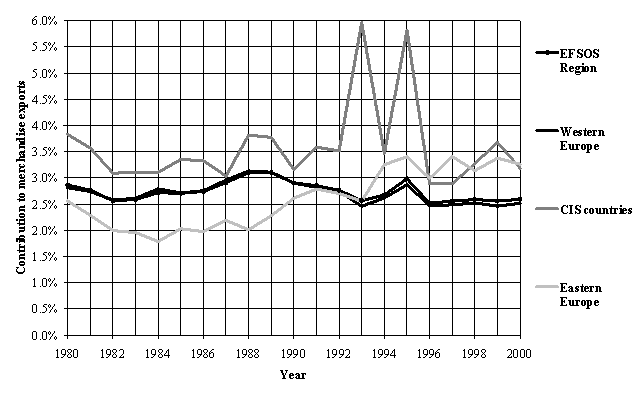 Section 2.6 described many of the features of the historical trends in forest products trade in Europe over the last few decades. This section describes the importance of forest products trade to economies in terms of the contribution of forest products exports to total exports of goods (i.e. merchandise exports).