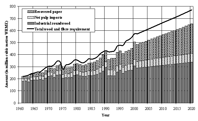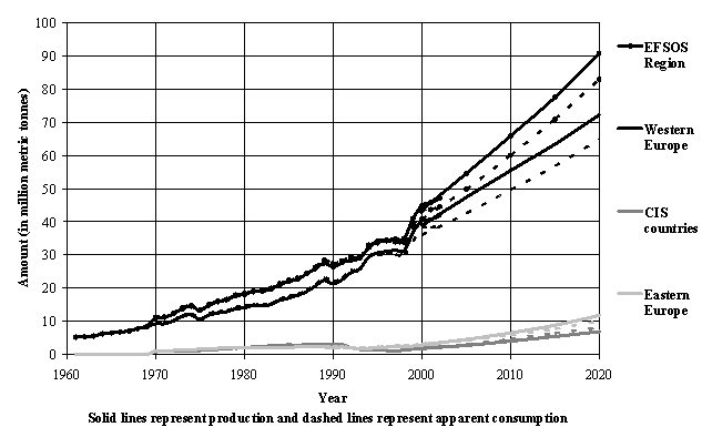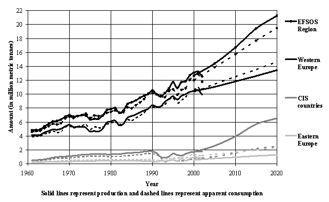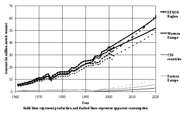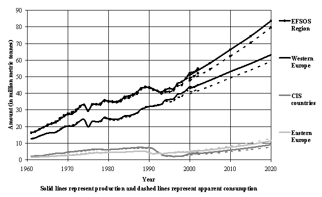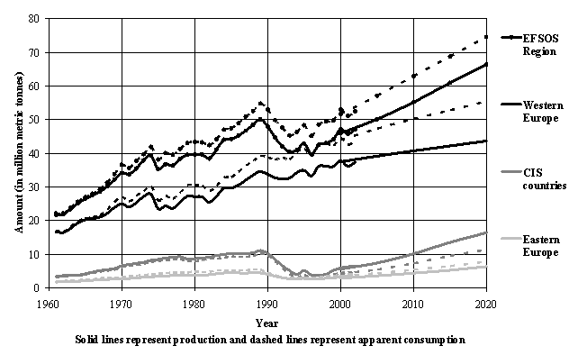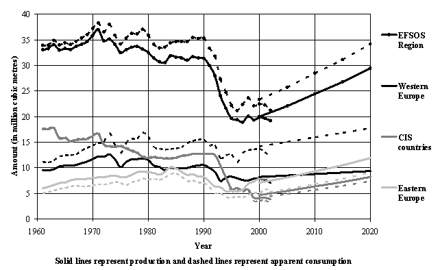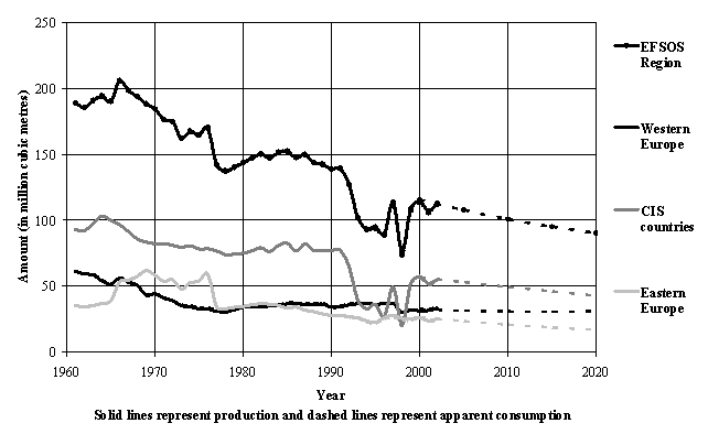 Source: trends (to 2000) derived from FAOSTAT production and trade statistics and projections (2001- 2020) from Kangas and Baudin (2003).