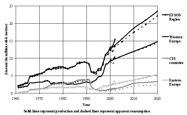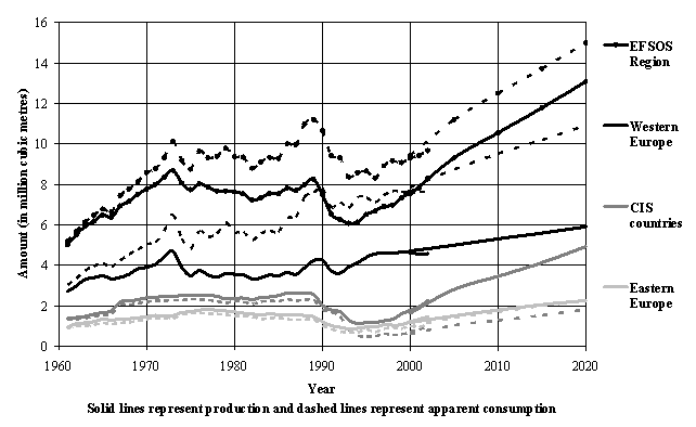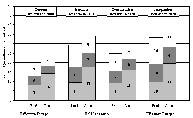 As in other sectors, the highest rate of growth in the future is expected in the CIS sub-region, although this will start from a very low level in 2000. Production will more than treble, from 2.7 million m3 in 2000 to 9.0 million m3 in 2020 (an average increase of 6.2 percent per year). Consumption will increase slightly faster than this, from 2.9 million m3 in 2000 to 9.7 million m3 in 2020 (an average increase of 6.3 percent per year). Thus, net imports into the CIS sub-region will increase, but remain quite insignificant.