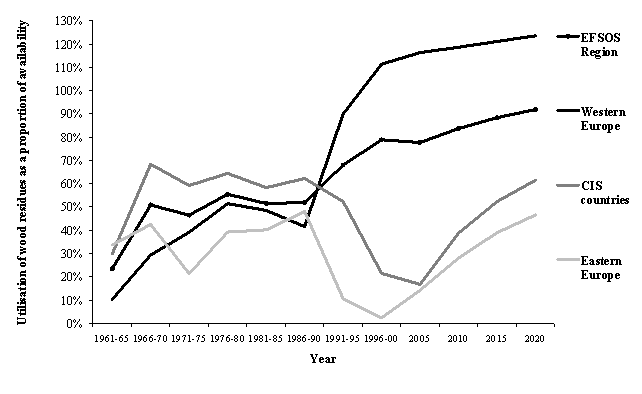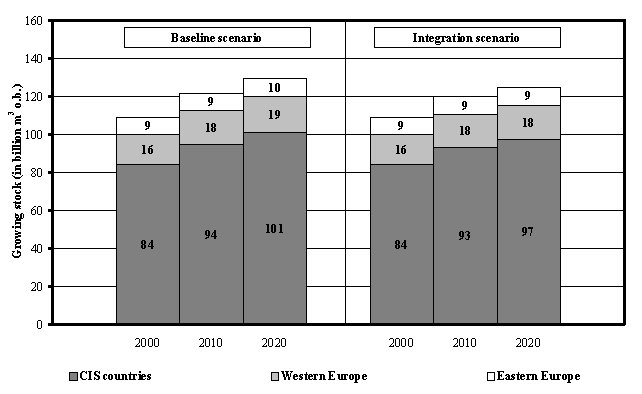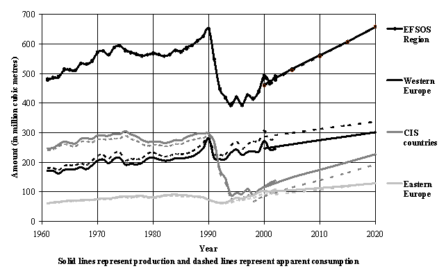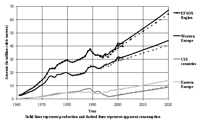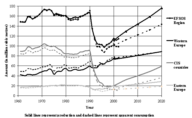 This rapid expansion is due to the high rate of economic growth expected in the CIS sub-region over the next two decades. However, the projected increase in production will be feasible, due to the abundance of forest resources in this sub-region. For example, the projected levels of production and consumption in 2020 will still be well below the levels achieved in the past.